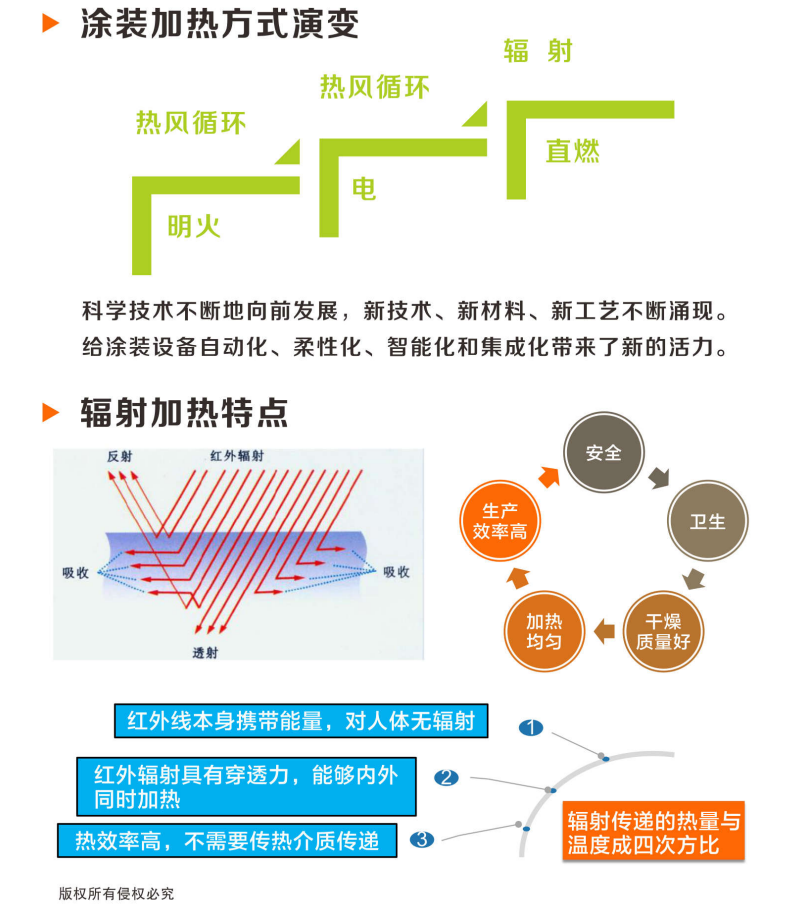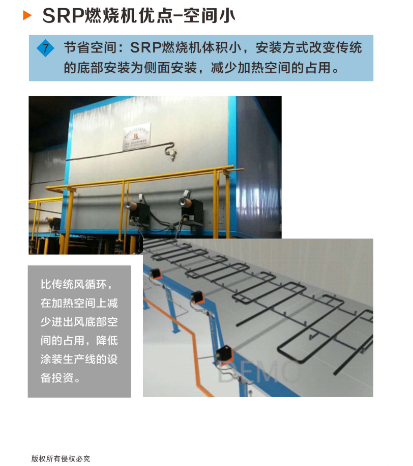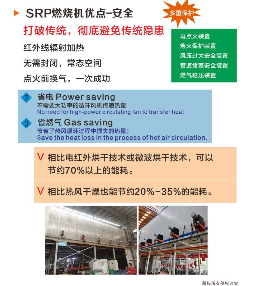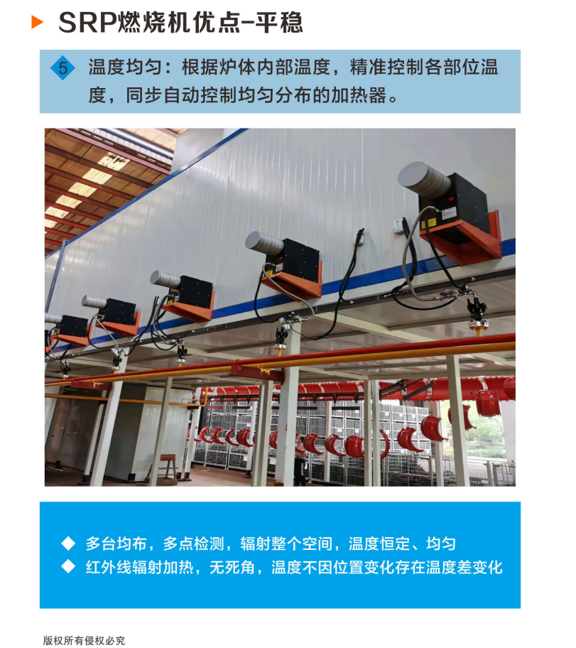 紅外線輻射燃燒機(jī)體積小,安裝方式改變傳統(tǒng)的底部安裝為側(cè)面安裝,減少加熱空間的占用。