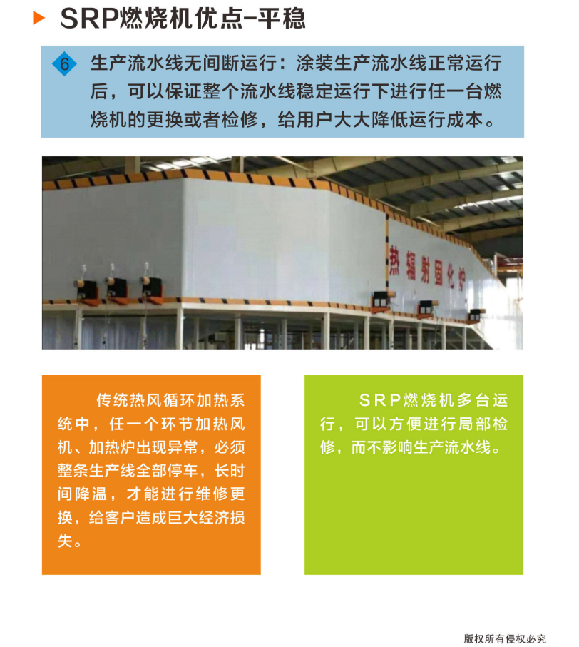 涂裝生產(chǎn)流水線正常運(yùn)行后,可以保證在整個(gè)流水線穩(wěn)定運(yùn)行的情況下,進(jìn)行任一臺燃燒機(jī)的更換或者檢修,給用戶大大降低運(yùn)行成本。